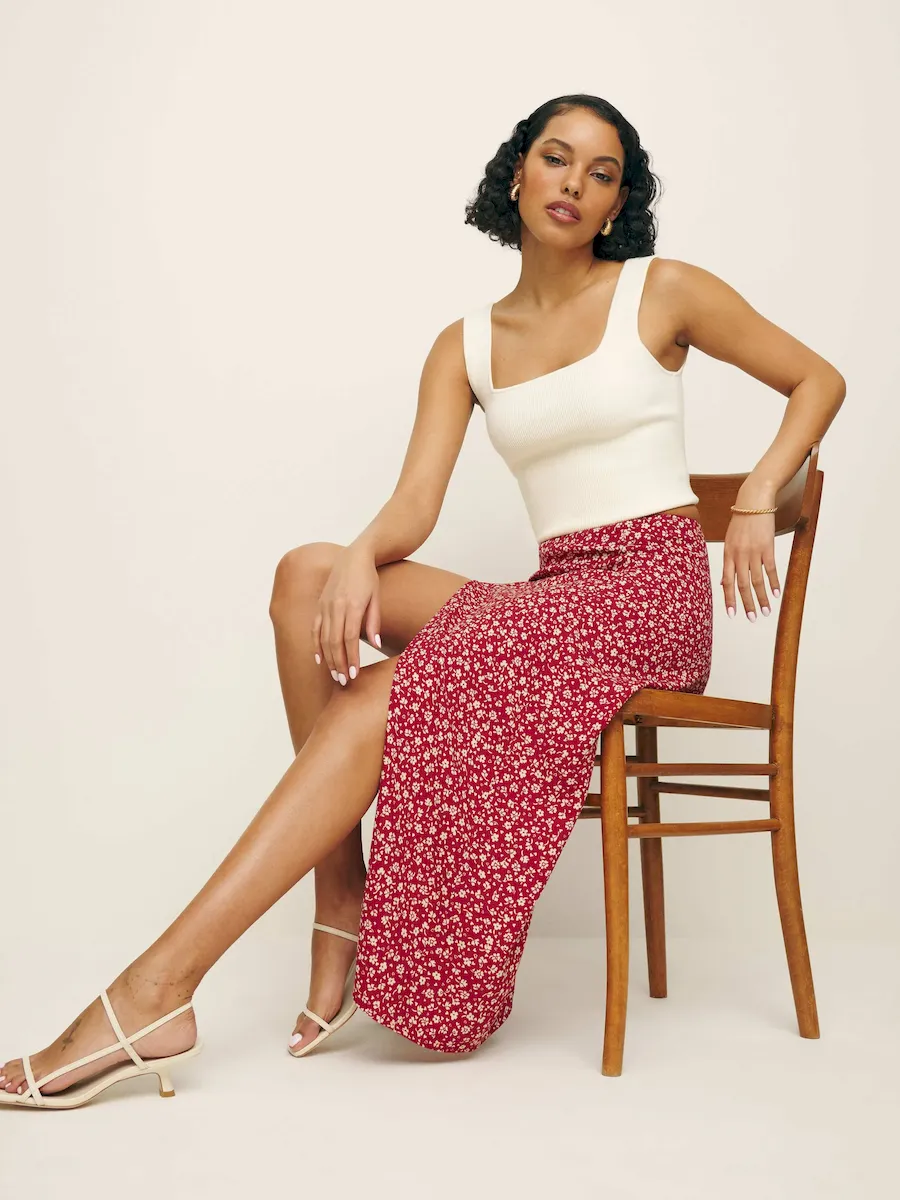 The model is wearing a size 0 and has a 23.5″ waist, 34″ hips.